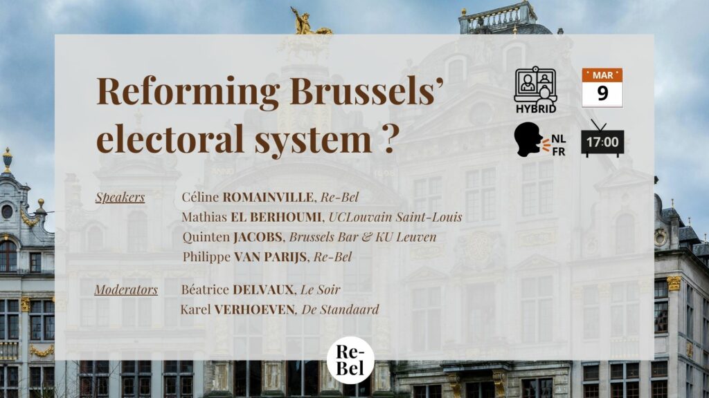 Cette proposition, ainsi les enjeux qui la sous-tendent, sera présentée et discutée lors de l’événement public Re-Bel. Une réforme électorale à Bruxelles est-elle nécessaire et opportune dans le contexte actuel? Dans quelle mesure convient-il d’assurer la représentation des néerlandophones à Bruxelles dans l’organisation électorale? Que penser des propositions de suppression de la représentation garantie? Faut-il maintenir l’exigence d’une double majorité au sein des deux groupes linguistiques pour la formation d’un nouveau gouvernement bruxellois ? Ces questions seront traitées lors de l’événement public Re-Bel du 9 mars, de 17h à 19h, à la Fondation universitaire (11 rue d’Egmont, 1000 Brussels) et en ligne.